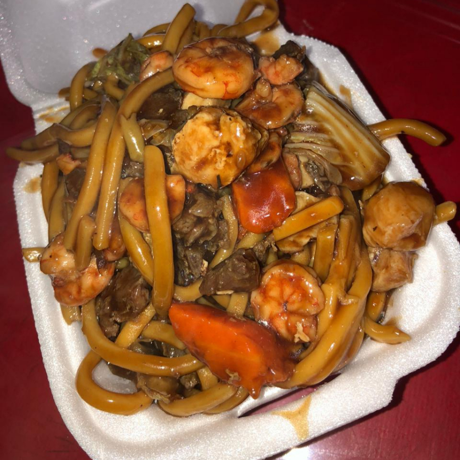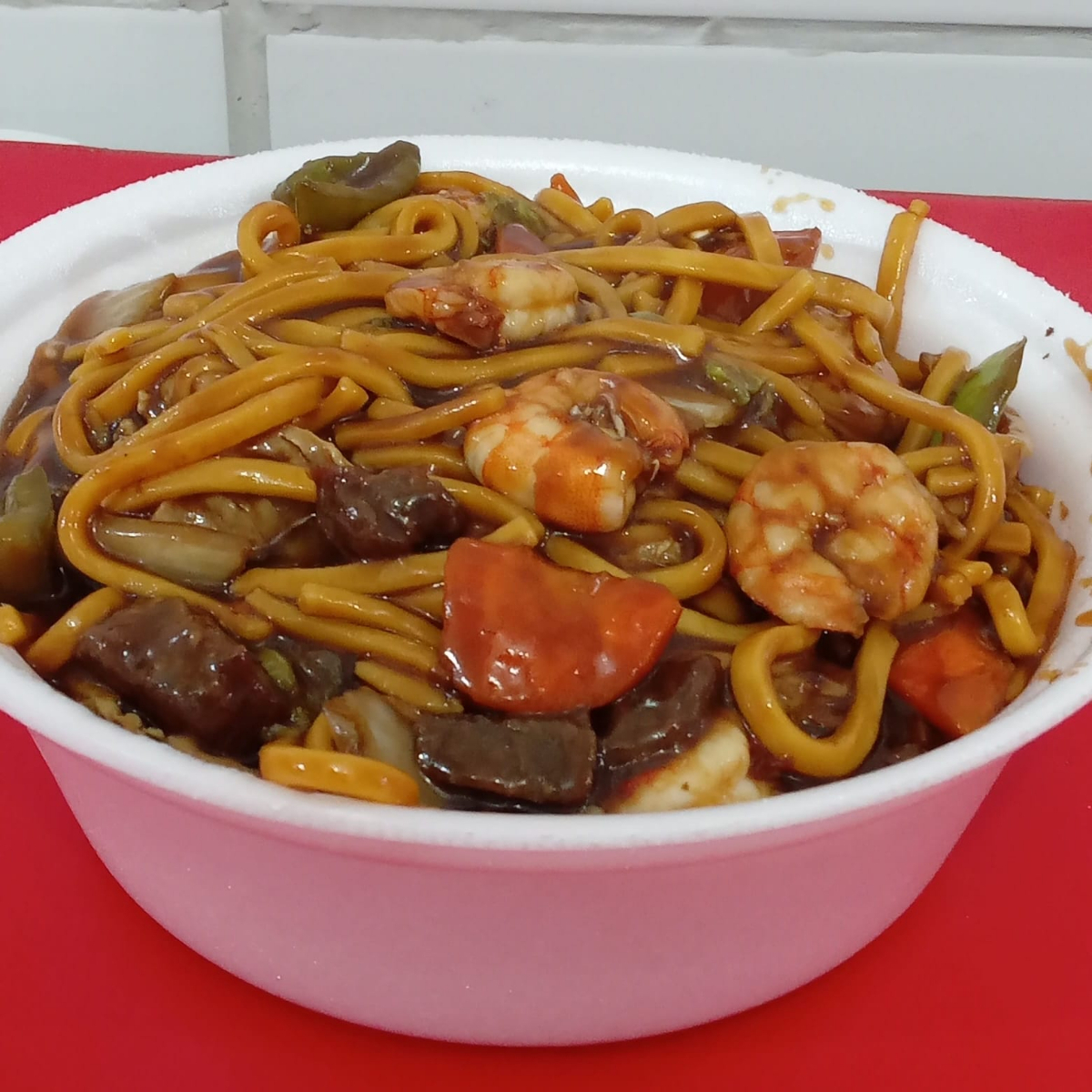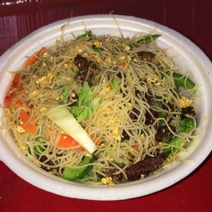 Bifum da Casa: porção para duas pessoas, preparada com macarrão de arroz (bifum), carne bovina e frango, cenoura, repolho, brócolis, couve-flor e molho shoyu especial da casa.