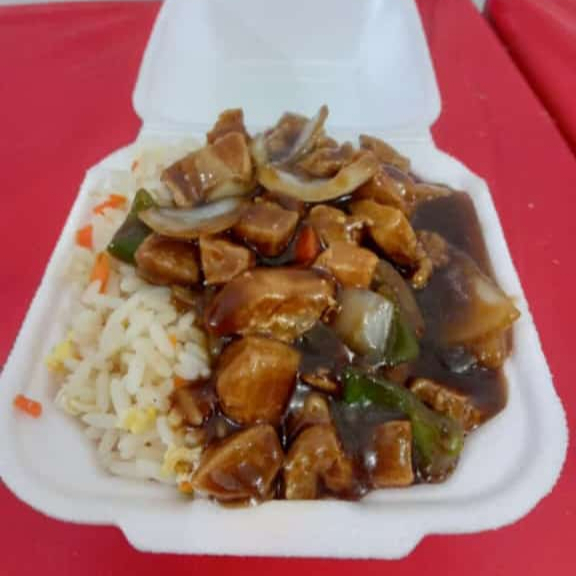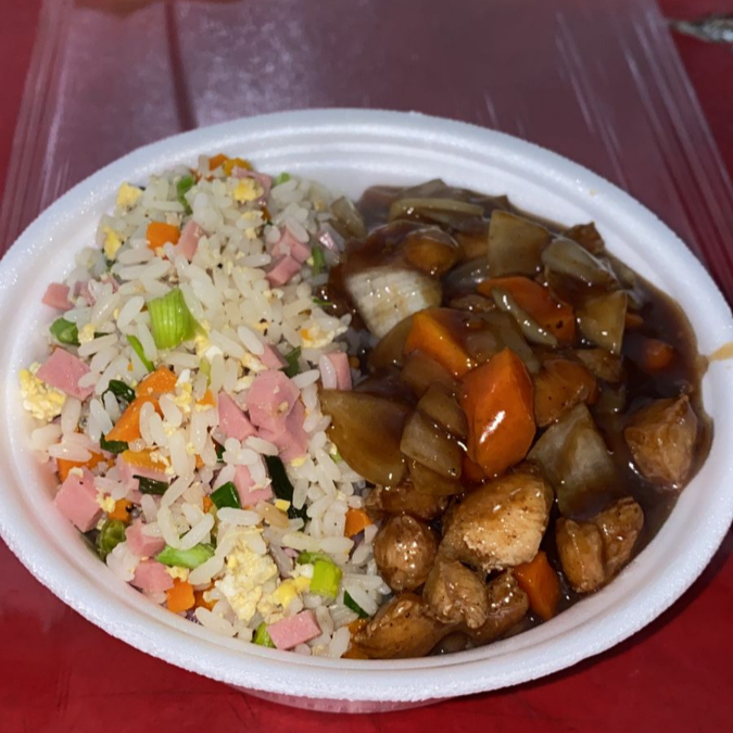 Frango Xadrez: porção individual para uma pessoa, preparada com cubos de frango, cebola, pimentão, molho shoyu e temperos especiais da casa, acompanhada de arroz chop suey.