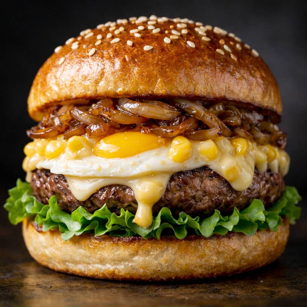 PÃO BOLA DE GERGELIM, 90 GRAMAS DE CARNE ARTESANAL QUEIJO MUSSARELA, SALADA, OVO, CREME DE MILHO E CEBOLA CARAMELIZADA.