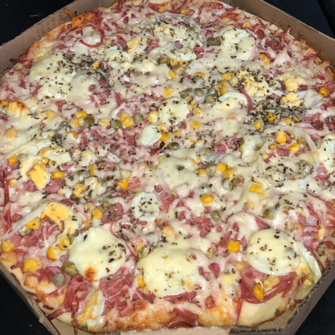 Massa da casa com meia portuguesa (presunto, queijo mussarela, ovos cozidos, cebola, azeitonas e orégano) e meia charque (carne de charque desfiada, cebola, queijo mussarela, orégano).