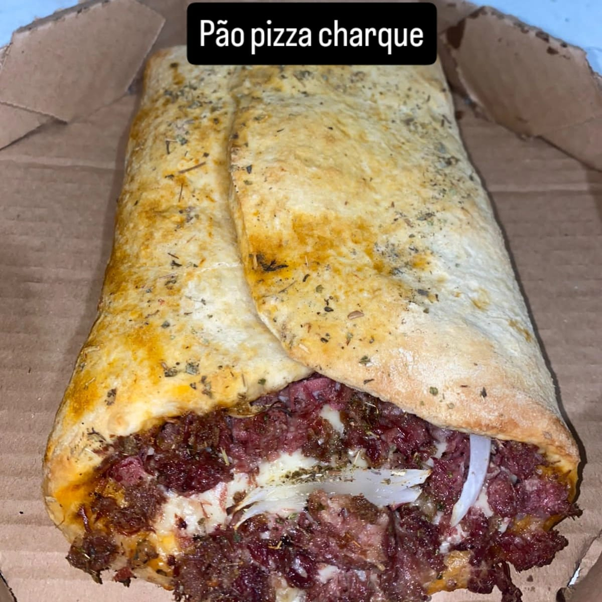 Massa da casa, charque dessalgada e desfiada, molho de tomate, queijo muçarela, cebola e orégano.