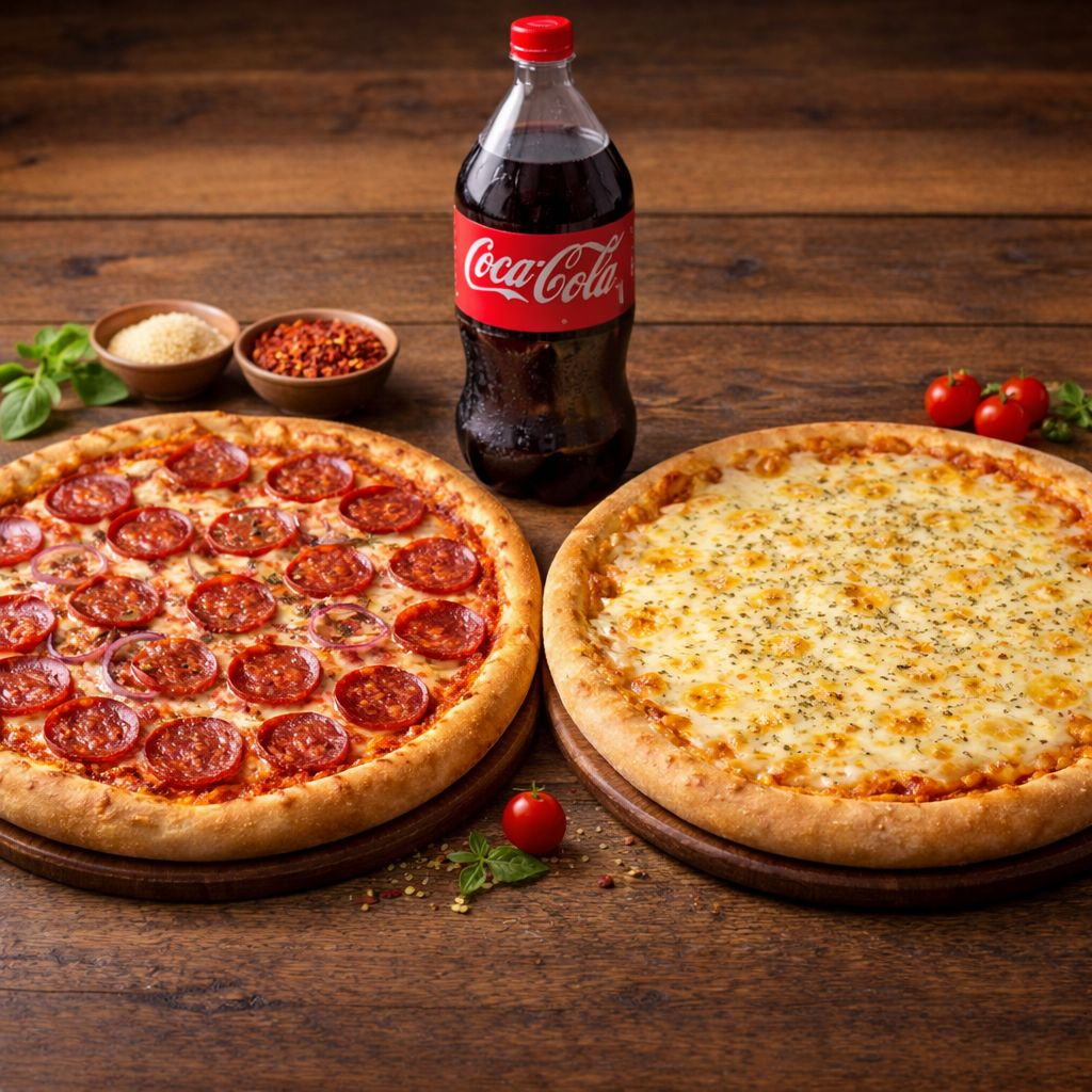 Duas pizzas grandes com massa artesanal crocante e macia, sendo uma de calabresa com molho de tomate especial, mussarela e calabresa fatiada suculenta, e outra de mussarela com molho de tomate e queijo bem derretido e dourado; acompanha 1 Coca-Cola de 2 litros.