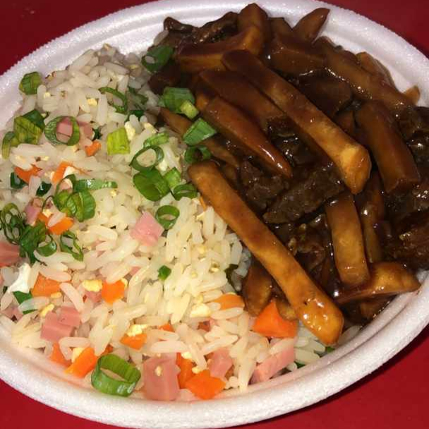 Carne com Fritas ao Molho Shoyo: porção para duas pessoas, preparada com carne bovina em tiras, batatas fritas crocantes e molho shoyo especial da casa.