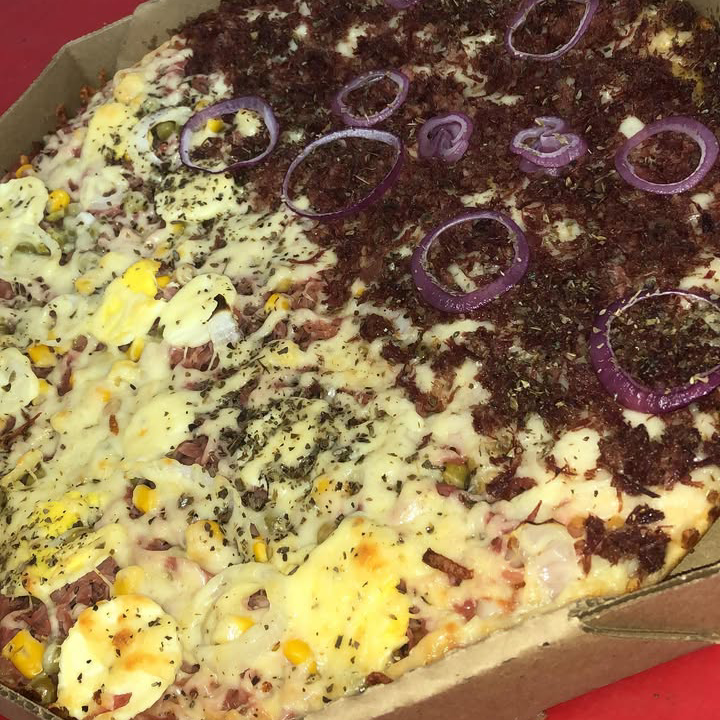 Massa da casa com meia charque (carne de charque desfiada, cebola, queijo mussarela, orégano) e meia frango (frango desfiado, cebola, queijo mussarela, orégano).