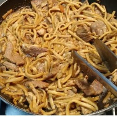 Macarrão, carne, frango e molho de soja.
