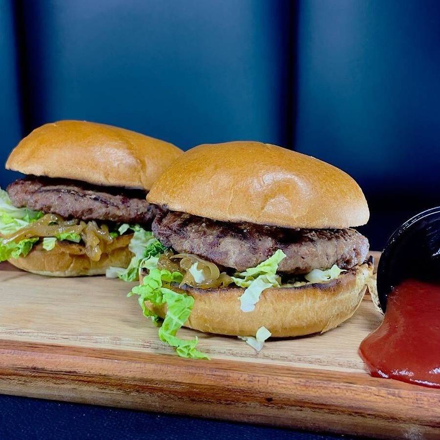 Pão, hambúrguer gourmet 180g, queijo cheddar, alface, cebola assada e 2 opções de molho