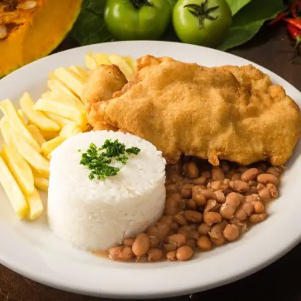 FRANGO À MILANESA FEIJÃO MACASSAR OU MULATO, ARROZ, MACARRÃO FAROFA, SALADA E BATATA