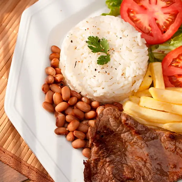BIFE ACEBOLADO FEIJÃO MACASSAR OU MULATO, ARROZ, MACARRÃO ,FAROFA, SALADA E BATATA