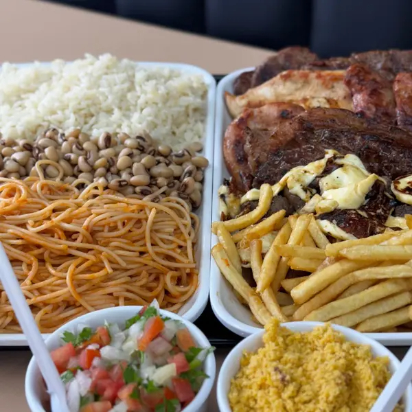 SERVE 4 PESSOAS COM APROXIMADAMENTE 2 BIFE DE PATINHO 300g FRANGO GRELHADO, 200g CARNE DE SOL, 2 UNI TOSCANA QUEIJO COALHO , FRITAS E SALADA