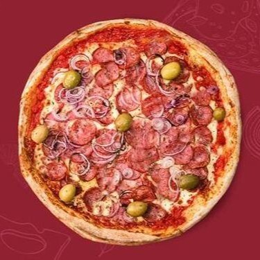 Massa italiana, Molho artesana, Mussarela Ralada, Calabresa defumada fatiada, Cebola Roxa e Orégano
