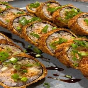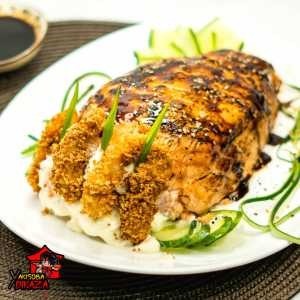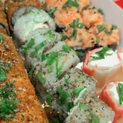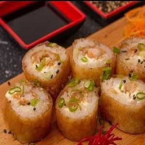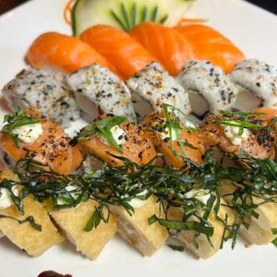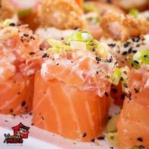 Delicioso Supremo recheado com skin empanado, arroz oriental, cream cheese, toques de cebolinho e manta de salmão por cima. Acompanha 1 teriaki e 2 shoyu.