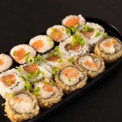 12 Carioca Skin, 10 Uramaki pasta salmao. Acompanha 1 teriaki e 2 shoyu