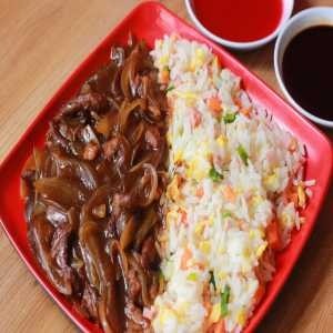 Arroz Chop Suey, com iscas de Carnes suculentas ao molho oriental e bem acebolada Porção individual 500g