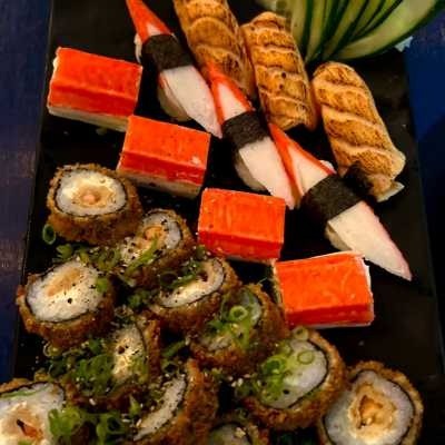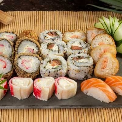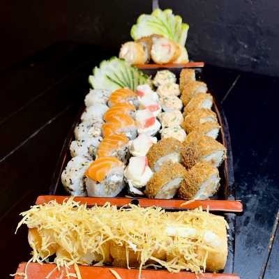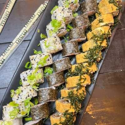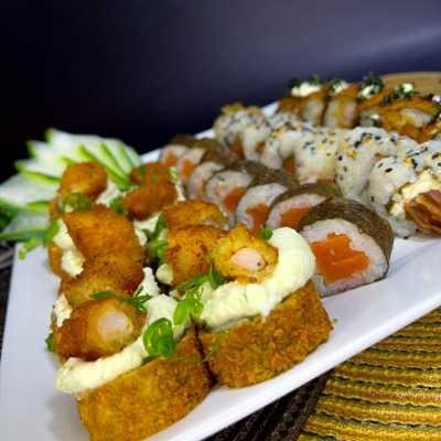 10 cariocas camarão, 5 uramaki skin, 5 osizushi salmão, 10 haruhot kani, 5 canapês de salmão, 5 canapês de kani. acompanha molhos