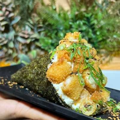 Enrolado na alga em forma de cone, recheado de arroz oriental, camarões naturais dentro, cream cheese e cebolinha. acompanha 1 teriaki e 1 shoyu.