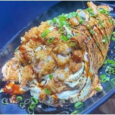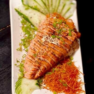 Supremo recheado com Arroz oriental, cream cheese, camarão empanado na frente, dentro recheado com skin, kani e salmão em pasta grelhada , envolto com lâmina de salmão cebolinho, gergelim. Acompanha 1 teriaki e sache shoyus.