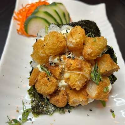 Nosso cone envolto com a alga, recheado com cream cheese, arroz oriental, camarão crocante e dadinho de queijo coalho crocante. Acompanha q shoyu e 1 teriaki