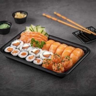 30peças de sushi- 10 Hossomaki Salmão, 10 uramaki kani, 10 canapê camarão Hot. 1 teriaki e 2 shoyus, 2 hashis.
