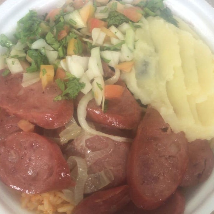 Mistura: Calabresa Acebolada, arroz e macarrão (Escolha nos Complementos Quais Acompanhamentos Deseja)