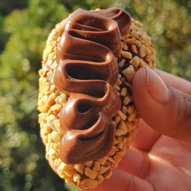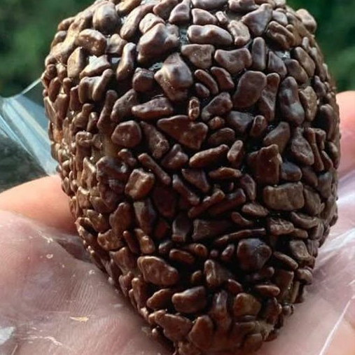 Coxinha recheada de brigadeiro, coberta com granulado crocante de chocolate.