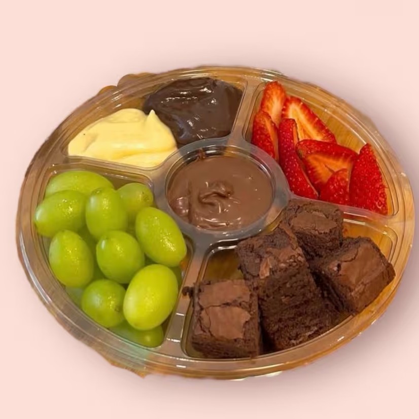 Petisqueira Gourmet, contém Brownie 50% Cacau, acompanhados de morangos e uvas frescas. Escolha o recheio da sua preferência para completar essa delícia. (Aprox: 300 gramas).