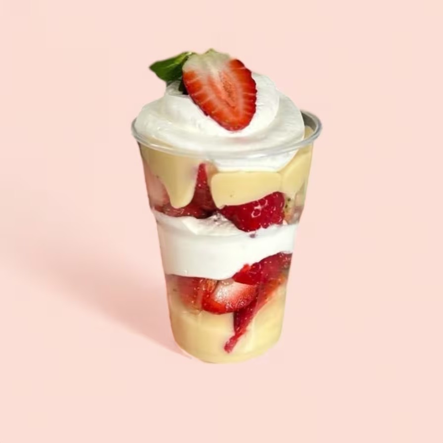Um delicioso bombom de morango, composto por um suave creme de Ninho, morangos, brigadeiro branco e bastante Nutella pura. (Copo 250 ml).