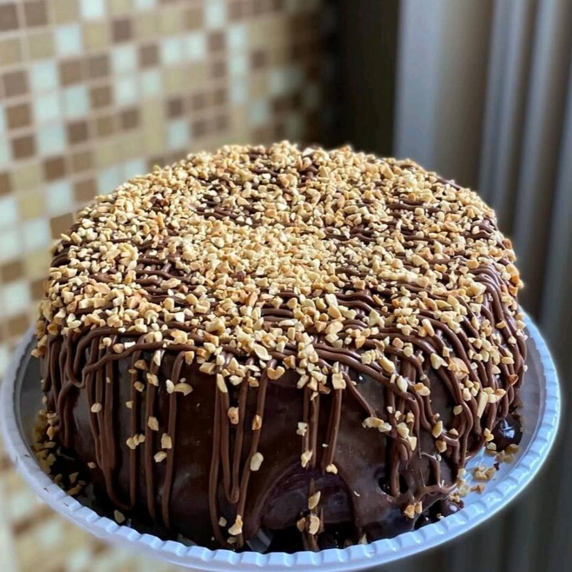 Bolo Vulcão com deliciosa massa de chocolate, recheio de cobertura de chocolate e finalizado com creme de avelã e amendoim granulado. (Aprox. 1,200 Kg).