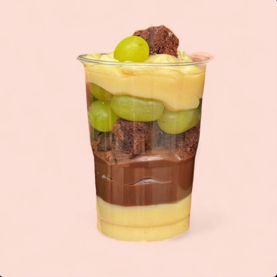 Camadas de brigadeiro branco, creme de Ninho, uva sem caroço e cobertura de brigadeiro com granulado e uvas. (Aprox: 2 Kg).