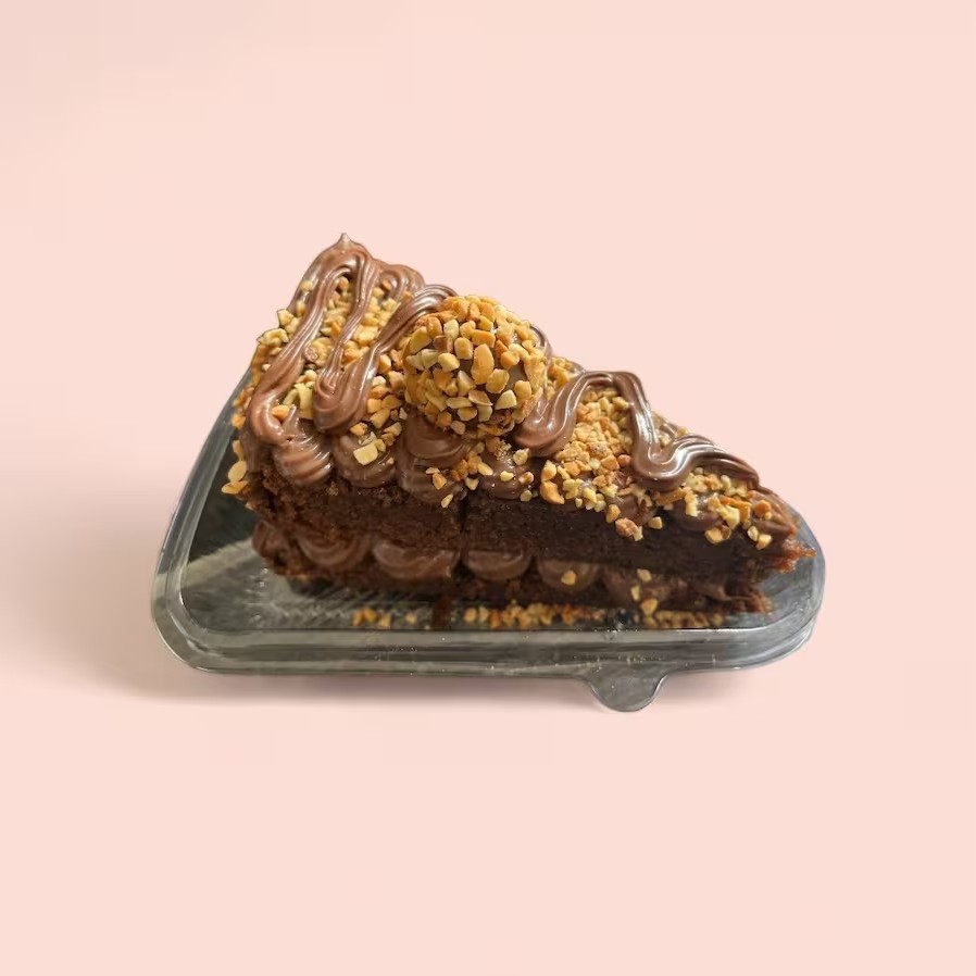 Generosa fatia de bolo com massa de chocolate e duas camadas de recheio de brigadeiro ao leite finalizado com brigadeiro de chocolate ao leite, amendoim granulado e Nutella. (Aprox: 350g).
