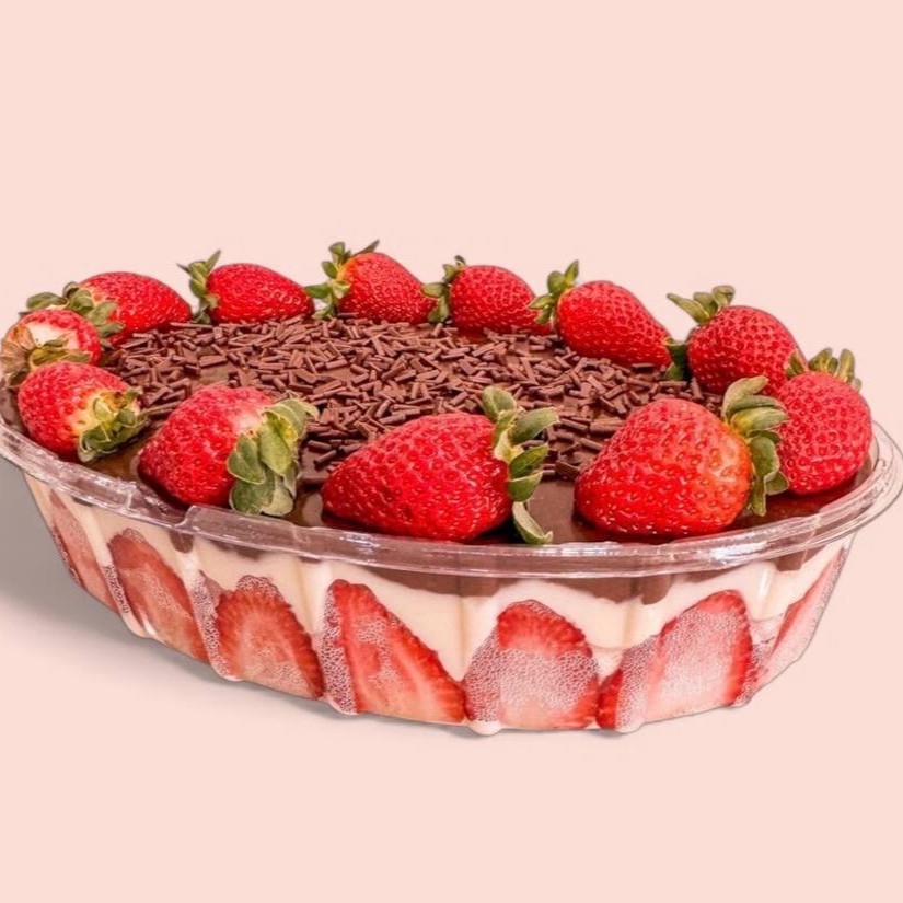 Camadas de brigadeiro branco, creme de Ninho, morangos e cobertura de brigadeiro com granulado e morangos frescos. (Aprox: 2 Kg).