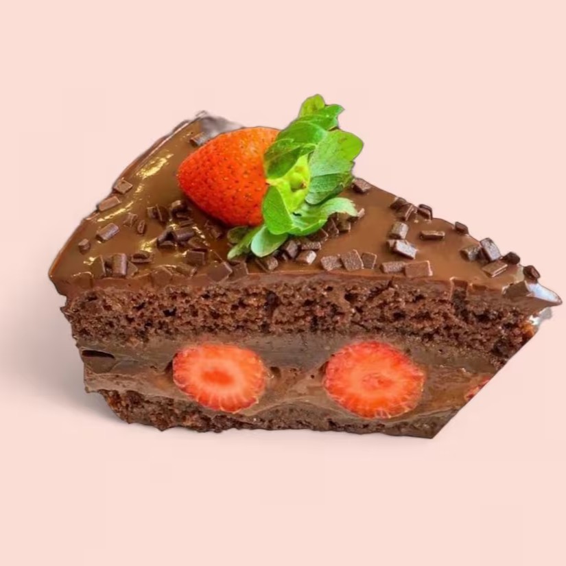Generosa fatia de bolo com massa de chocolate e duas camadas de recheio: brigadeiro ao leite, morangos e geleia de morango. (Aprox: 300g).