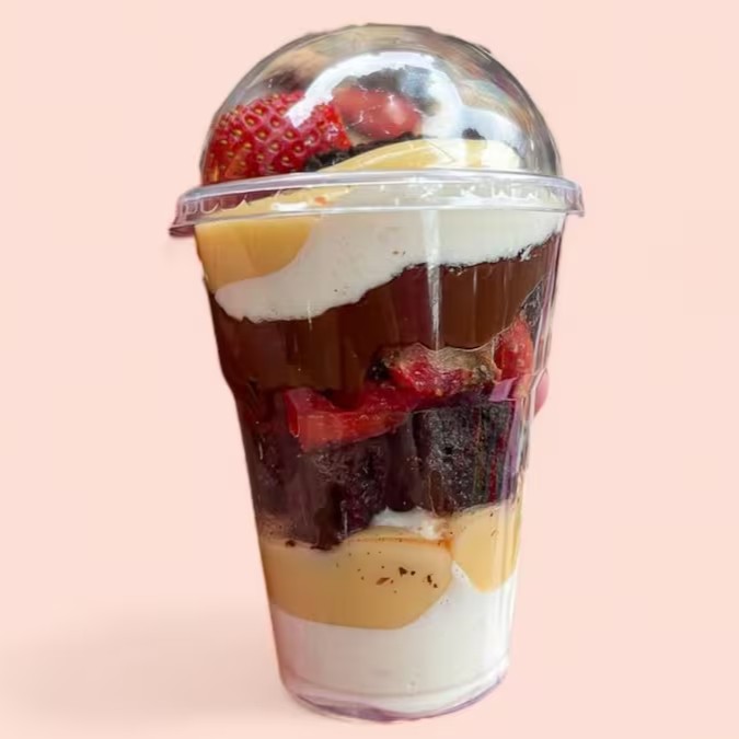 Brownie em pedaços, creme de Ninho, brigadeiro branco, morangos frescos, brigadeiro ao leite, e Nutella pura.