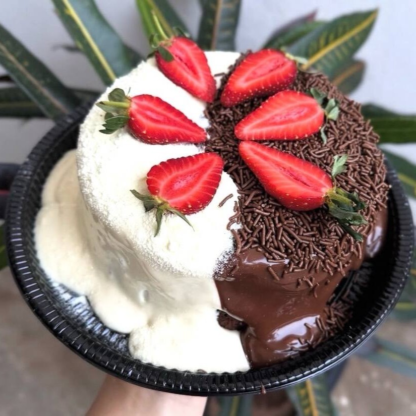 Bolo Vulcão com deliciosa massa de chocolate ou de baunilha, recheio de cobertura de chocolate e recheio de leite e finalizado com granulado e leite polvilhado e morangos. (Aprox. 1,000 kg).