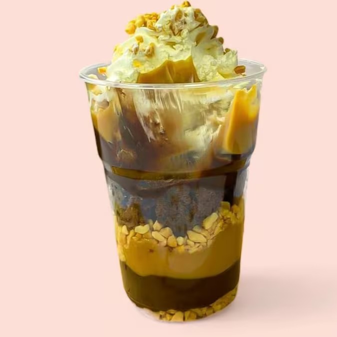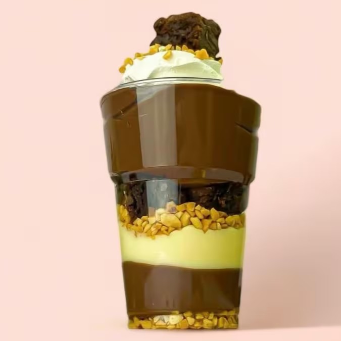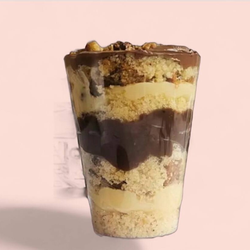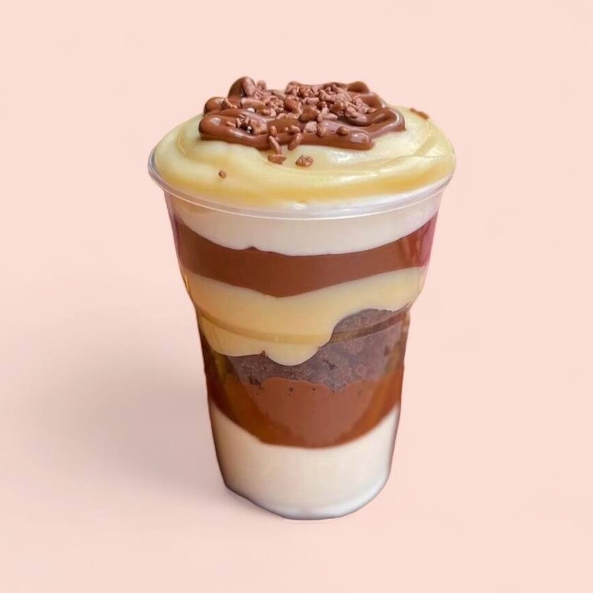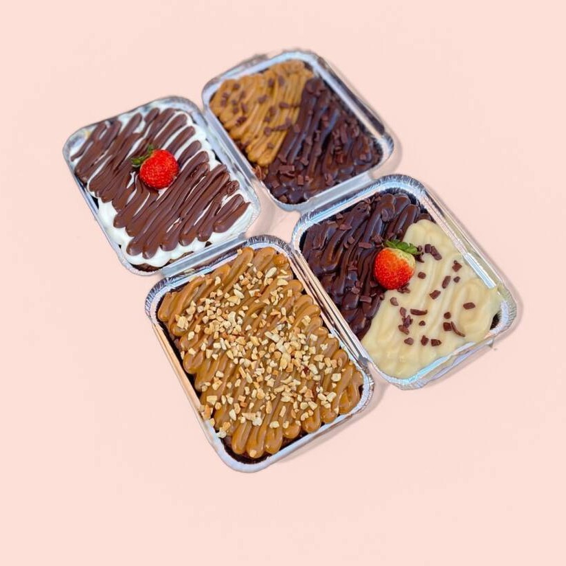 Brownie em pedaços, amendoim triturado, creme de Ninho, brigadeiro ao leite, e Nutella pura.
