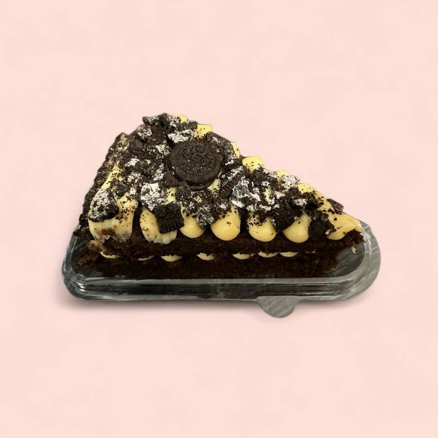 Generosa fatia de bolo com massa de chocolate, duas camadas de recheio: Brigadeiro de Oreo e brigadeiro branco finalizado com Oreo.