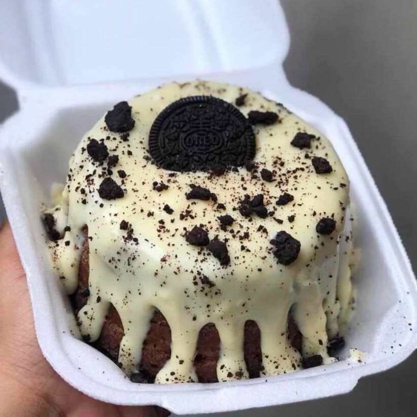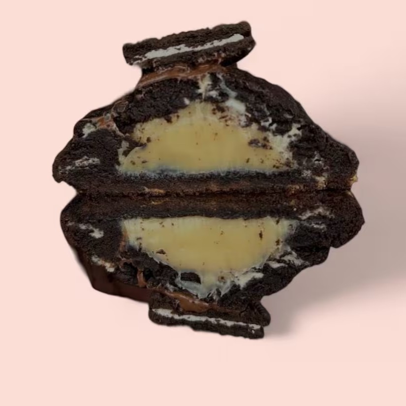 Massa fofinha 50% cacau com recheio cremoso de leite no centro, cobertura de chocolate baunilha e finalizado com Oreo. (350g).