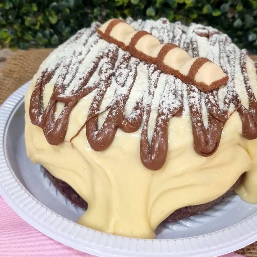 Massa de baunilha ou chocolate fofinha, recheio puro de Kinder Bueno no centro, coberto com recheio Ninho, finalizado com Nutella e Kinder Bueno.
