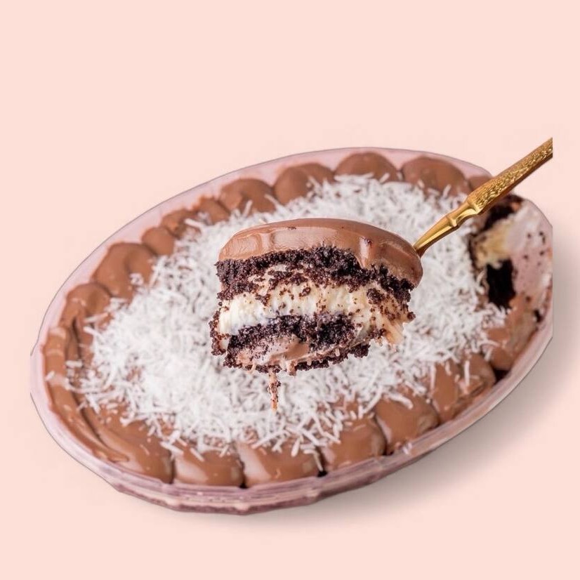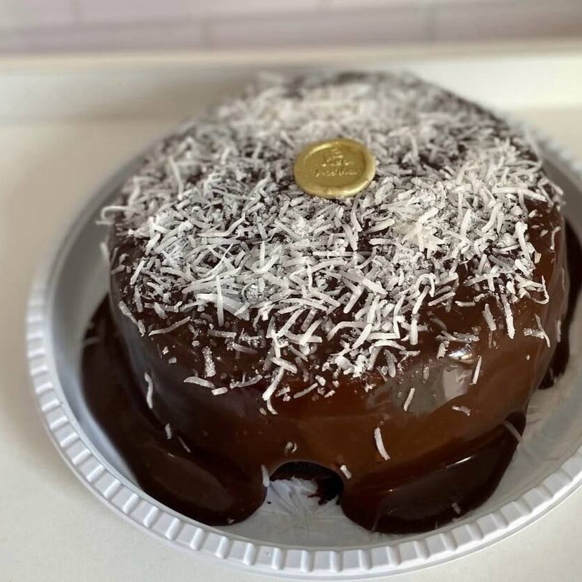 Bolo de chocolate com brigadeiro branco, brigadeiro preto, creme de Ninho e coco ralado, finalizado com coco. (Aprox: 2 Kg).