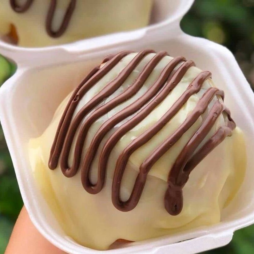Masssa macia de leite, cobertura de chocolate branco polvilhado com leite.