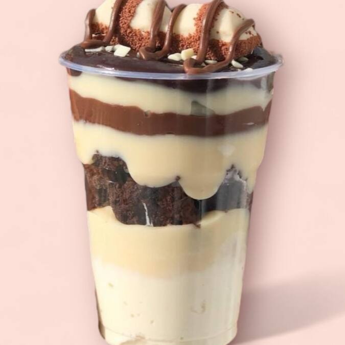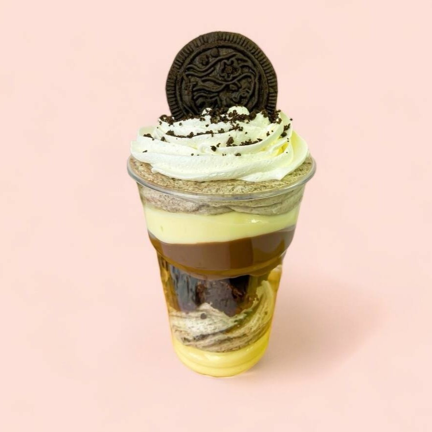 Brownie em pedaços, brigadeiro ao leite, creme de Ninho, creme de Oreo e Oreo em pedaços.