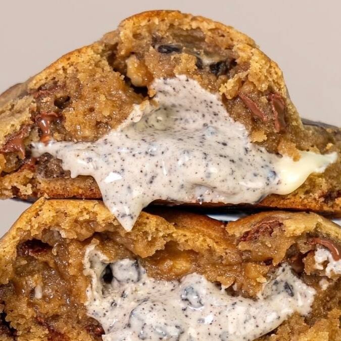 Massa de cookie black com gotas de chocolate branco, recheio de baunilha e pedaços de Oreo. (Aprox: 150 gramas).