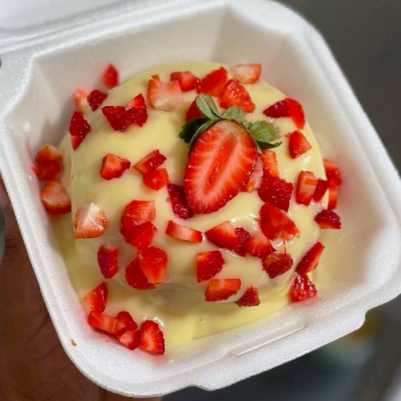 Massa fofinha de leite, recheio cremoso de Ninho e geleia de morango no centro, cobertura de chocolate branco e finalização com morangos. (350g).