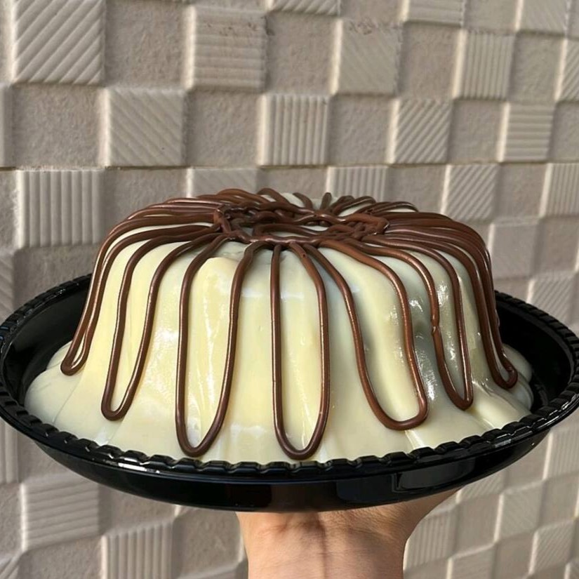 Bolo Vulcão com deliciosa massa de baunilha, recheio de cobertura de chocolate branco e finalizado com creme de avelã. (Aprox. 1,200 Kg).