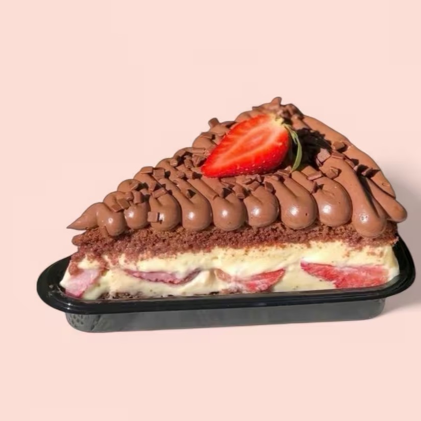 Generosa fatia de bolo com massa de chocolate e duas camadas de recheio: brigadeiro ao leite, brigadeiro branco, morangos e geleia de morango. (Aprox: 300g).