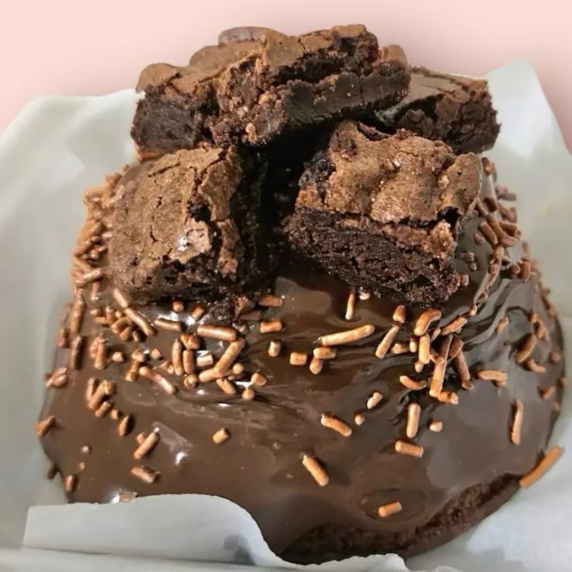 Explosão de chocolate! Massa fofinha 50% cacau com recheio cremoso de chocolate ao leite e finalização com granulado de chocolate e pedaços de Brownie. (350g).