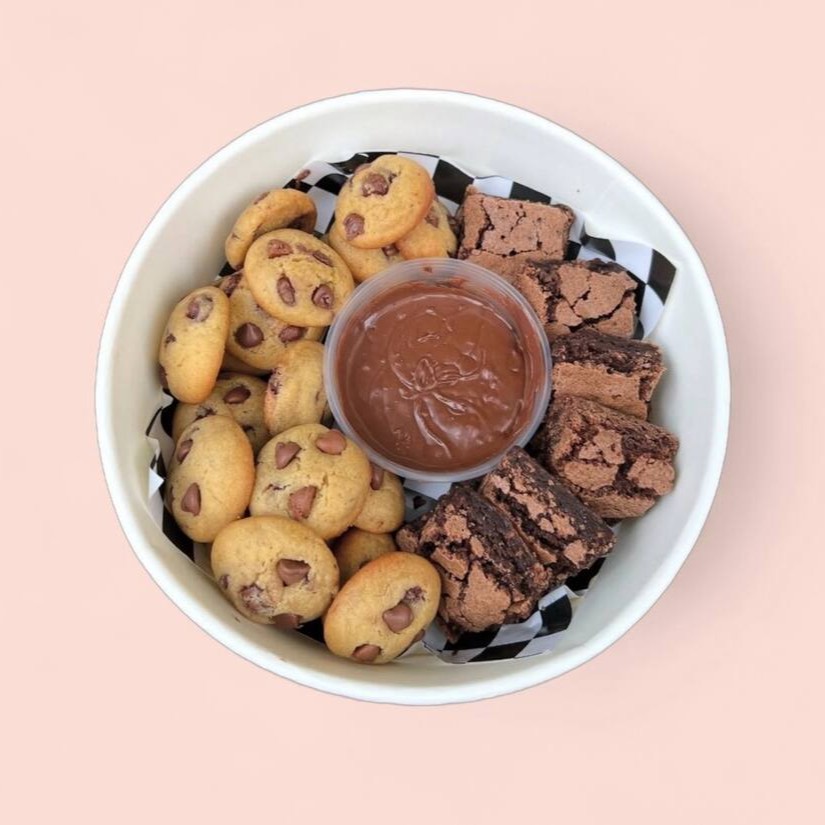 20 mini cookies de baunilha com gotas de chocolate + 7 mini brownies super macios + potinho de creme a sua escolha cremosa para mergulhar.