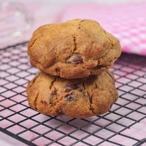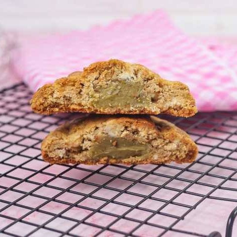 Massa úmida de pistache com gotas de chocolate branco + recheio de pistache. Macio por dentro e crocante por fora!