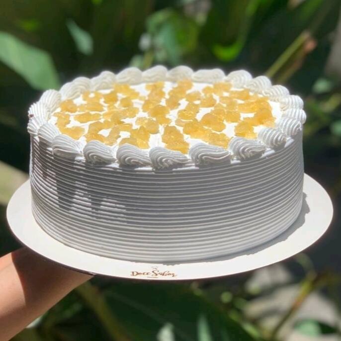 Massa branca molhadinha com recheio de abacaxi cremoso, finalizado com chantininho. Um verdadeiro espetáculo! Foto ilustrativa, não é o bolo inteiro, é a fatia dele, hihi.