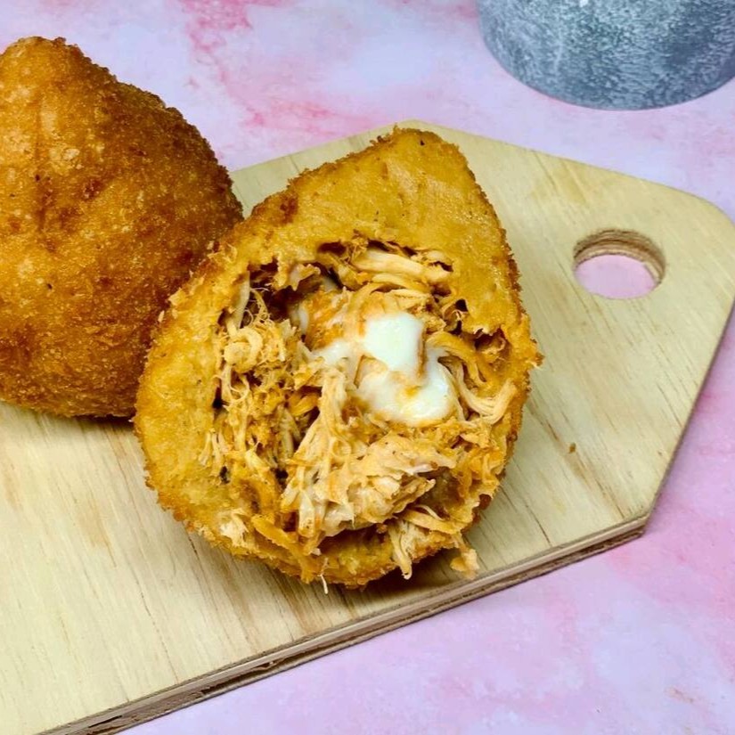 Porção com 10 unidades, recheado com queijo mussarela e presunto de peru. Bolinhas que derretem na boca!