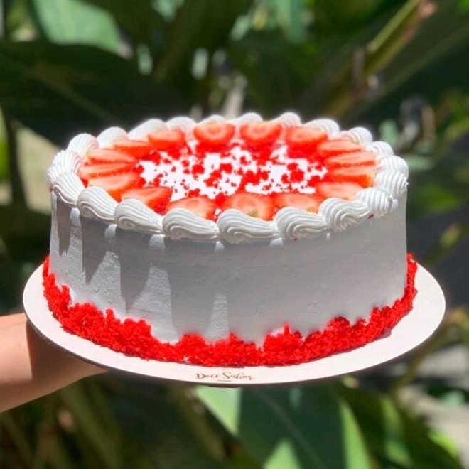 Três camadas de massa molhadinha red velvet + três camadas do nosso delicioso creme de Ninho e adicional de geleia de morangos artesanal, finalizado com chantininho.